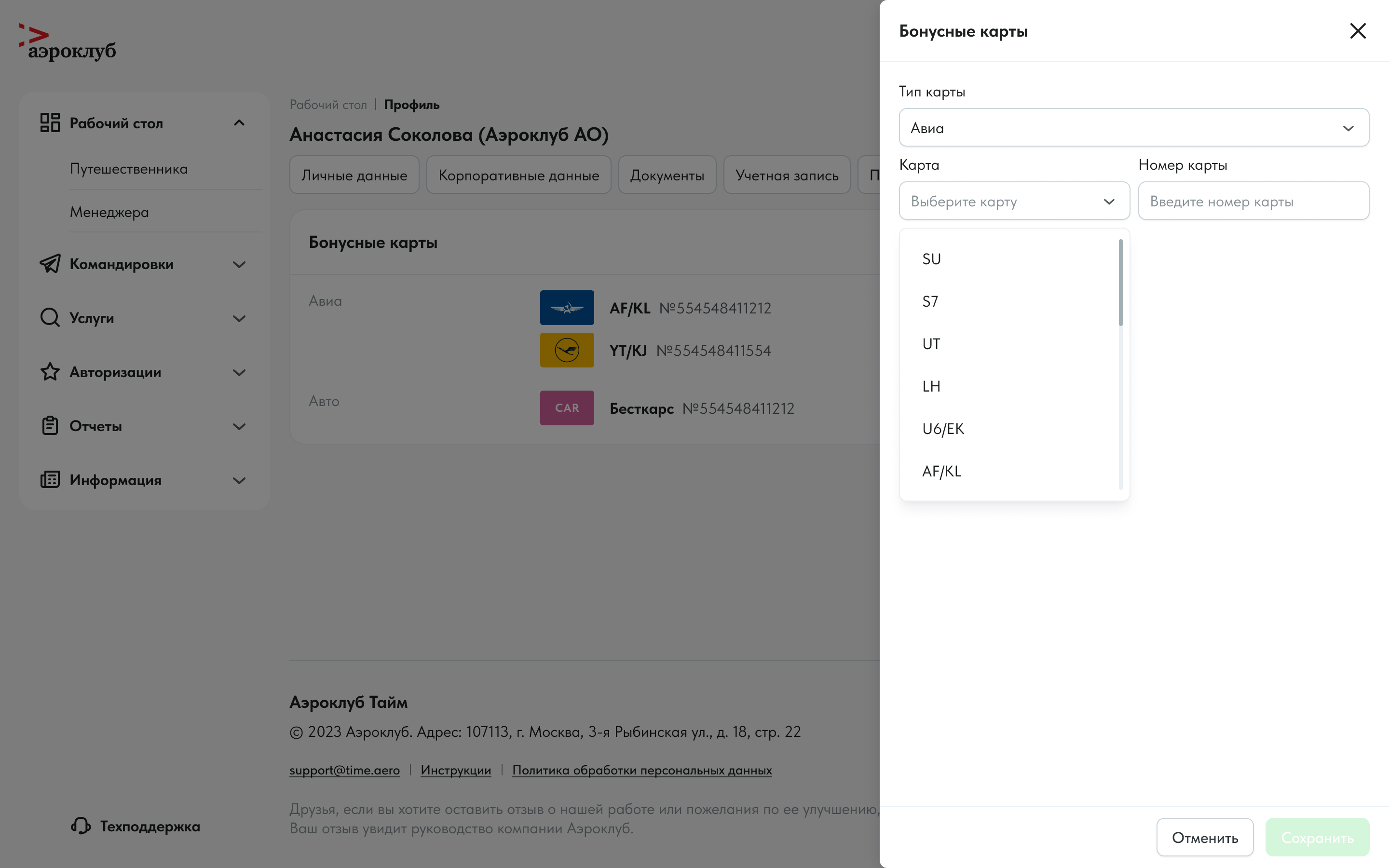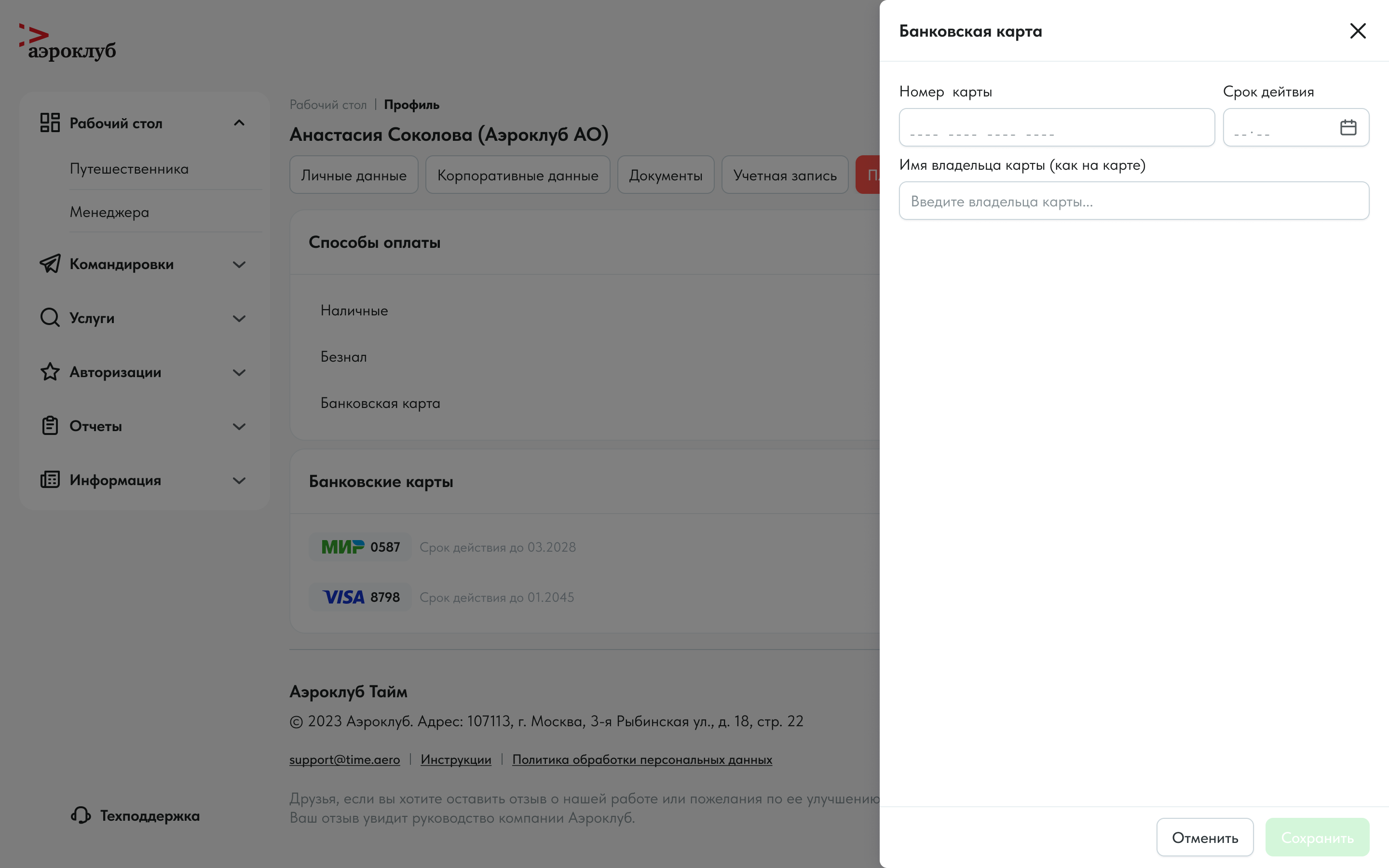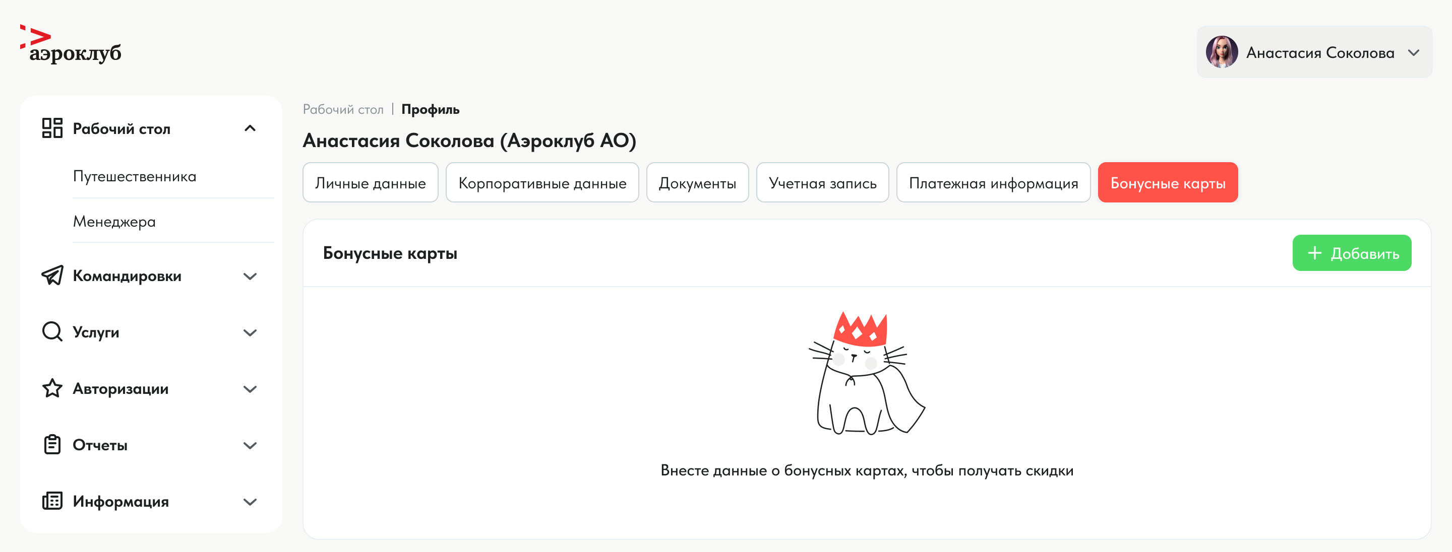 В разделе Банковские карты можно просматривать, добавлять, удалять информацию о банковских картах. Просмотр и изменение загруженных карт, а также добавление новых карт в данном разделе доступно только самому обладателю профиля. Исключение составляют компании, которым подключена соответствующая функция