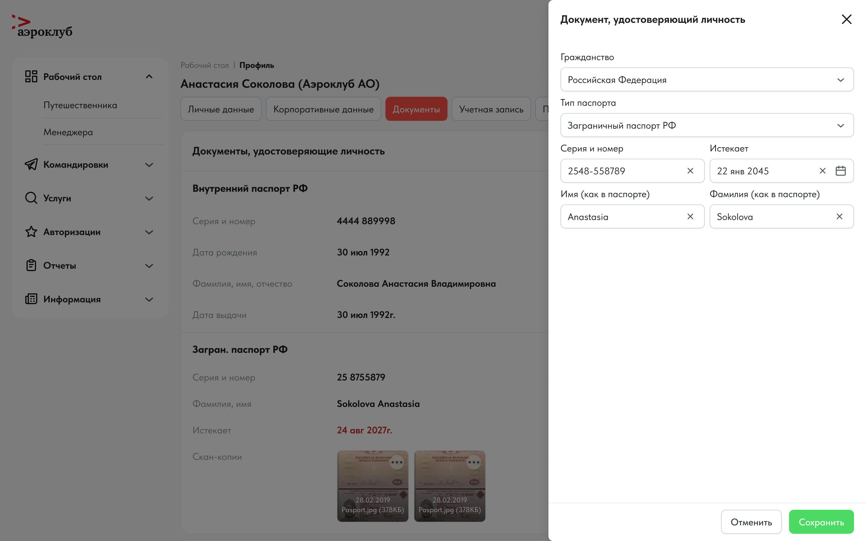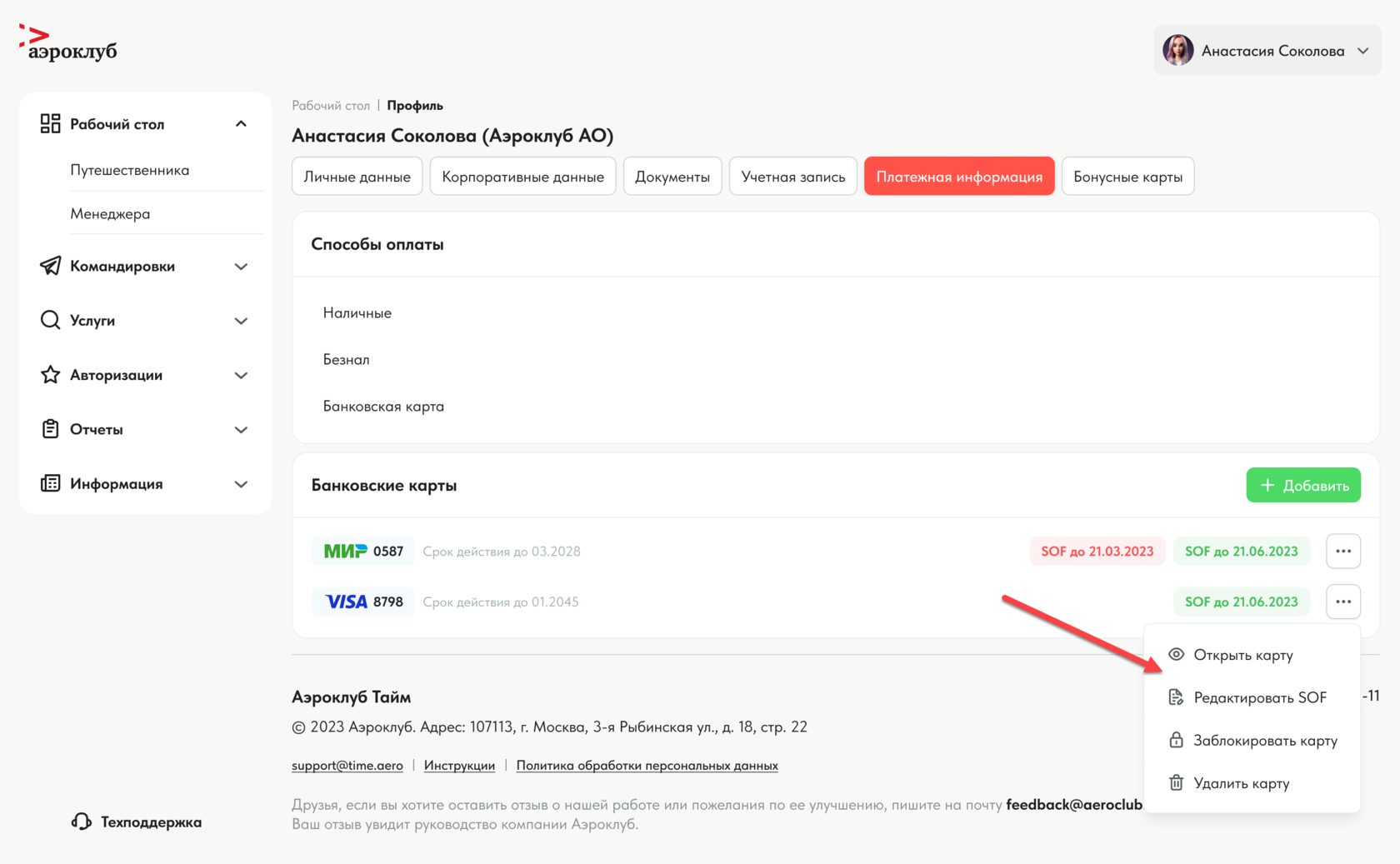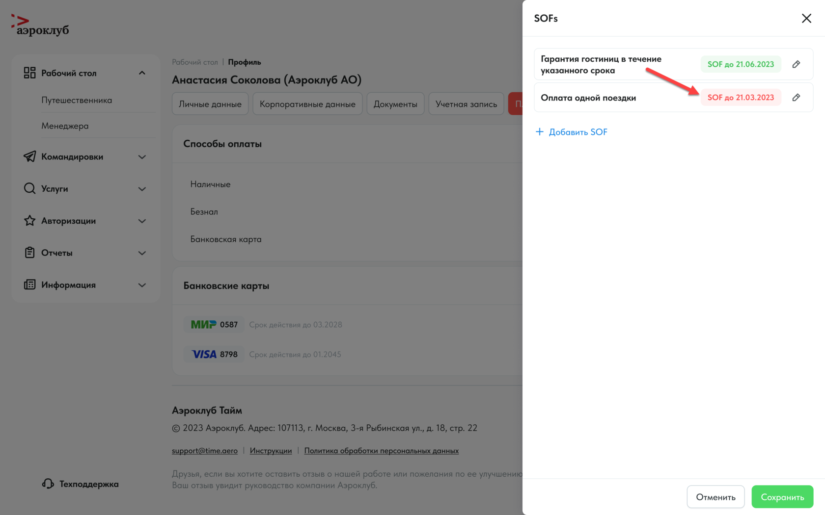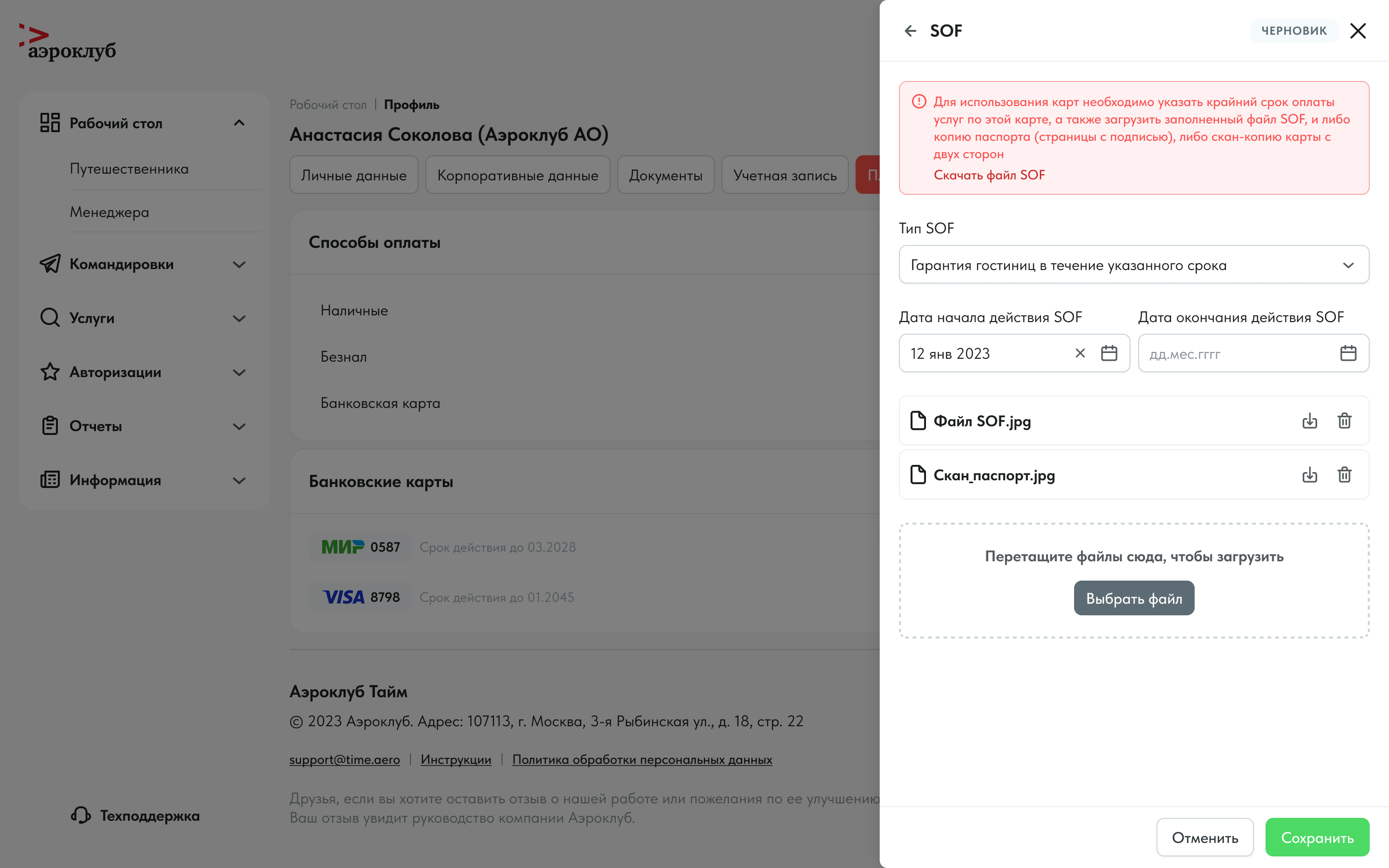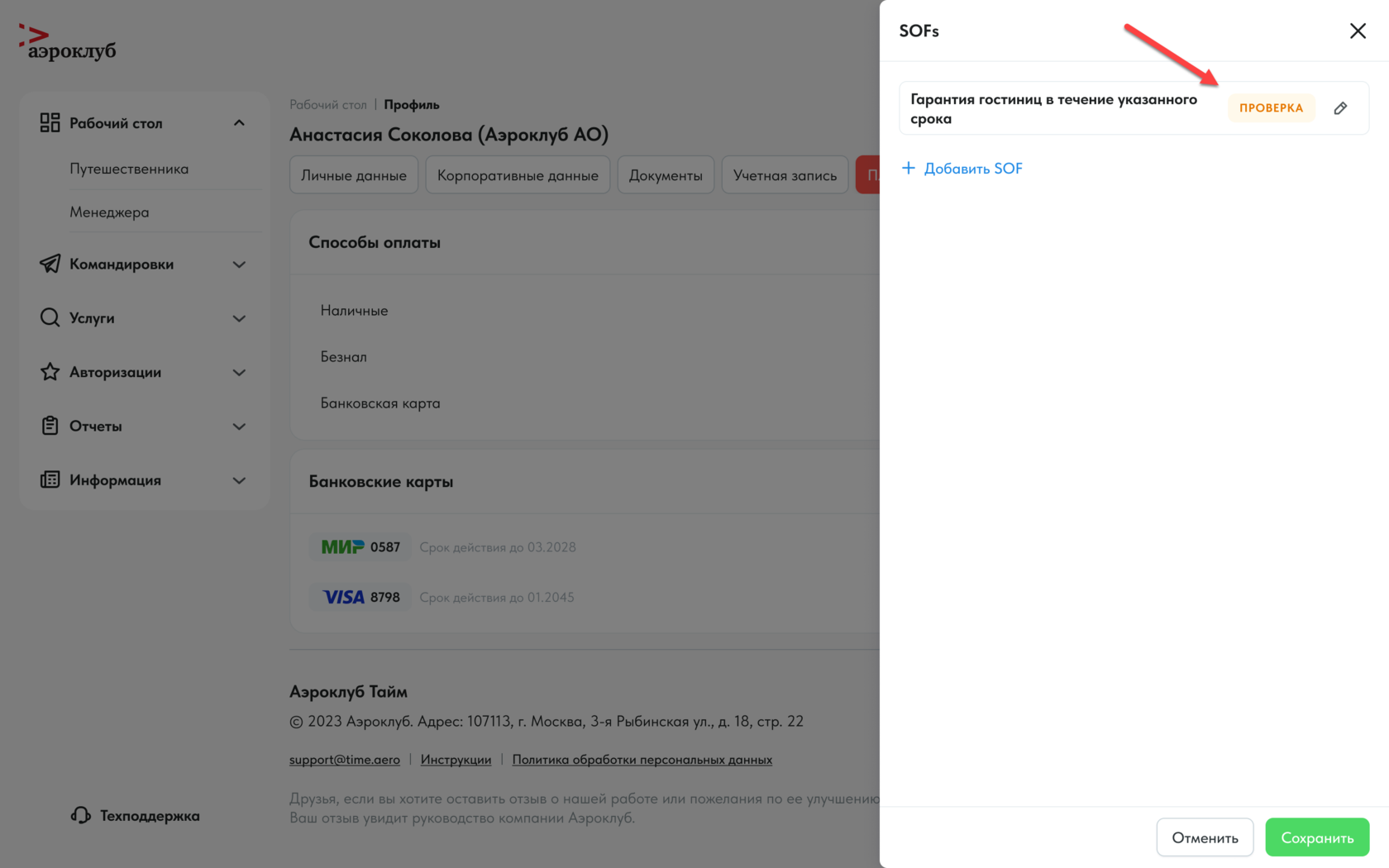 Заполните форму для добавления деталей Signature On File (SOF) к карте. После сохранения данных на почту группы обслуживания поступит уведомление о необходимости верифицировать данные добавленной карты. На время проверки SOF будет иметь статус «Проверка», после проверки и подтверждения - дата окончания срока действия